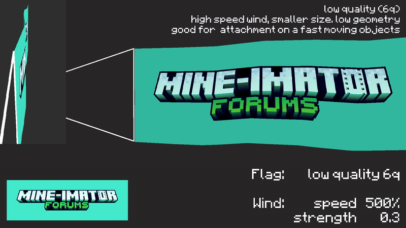 Instant waving flag for Mine-imator at seemingly no performance cost, it's all automatic. No need to animate it manually. Waving on multiple axis and it also supports any flag shapes!